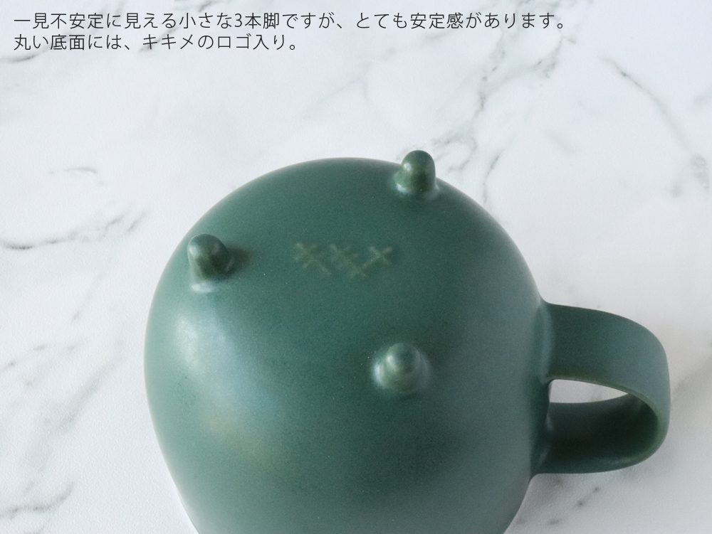 まあるいカップを支える3つの脚、持ち手はしっぽのようにも見え、今にも動き出しそうなフォルム。