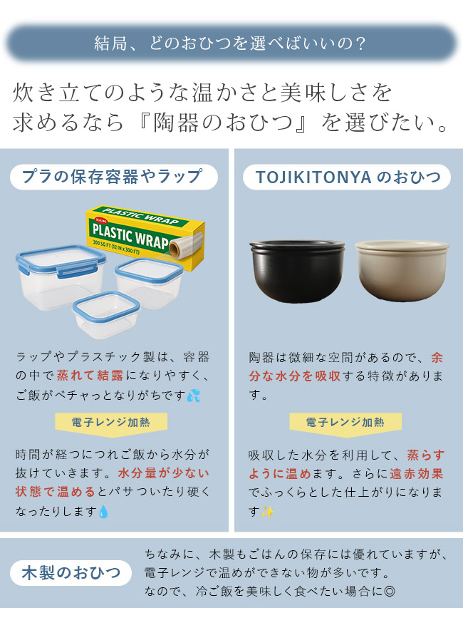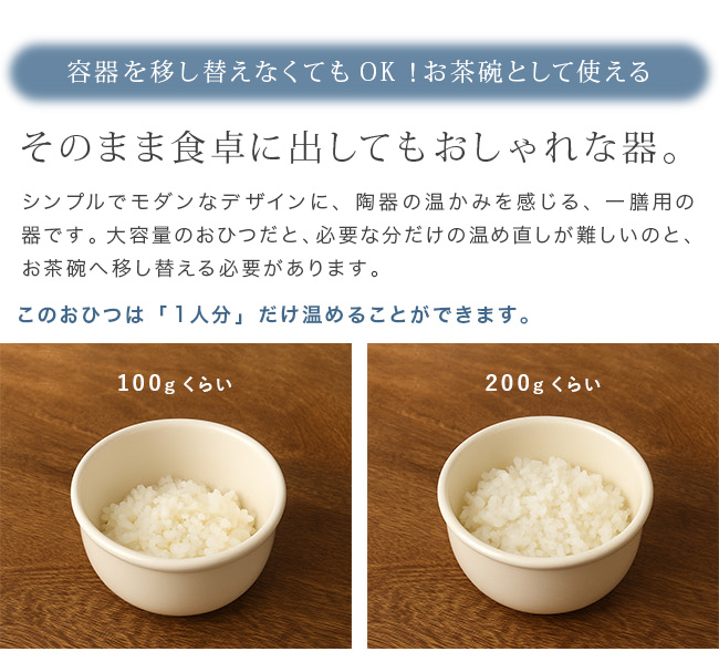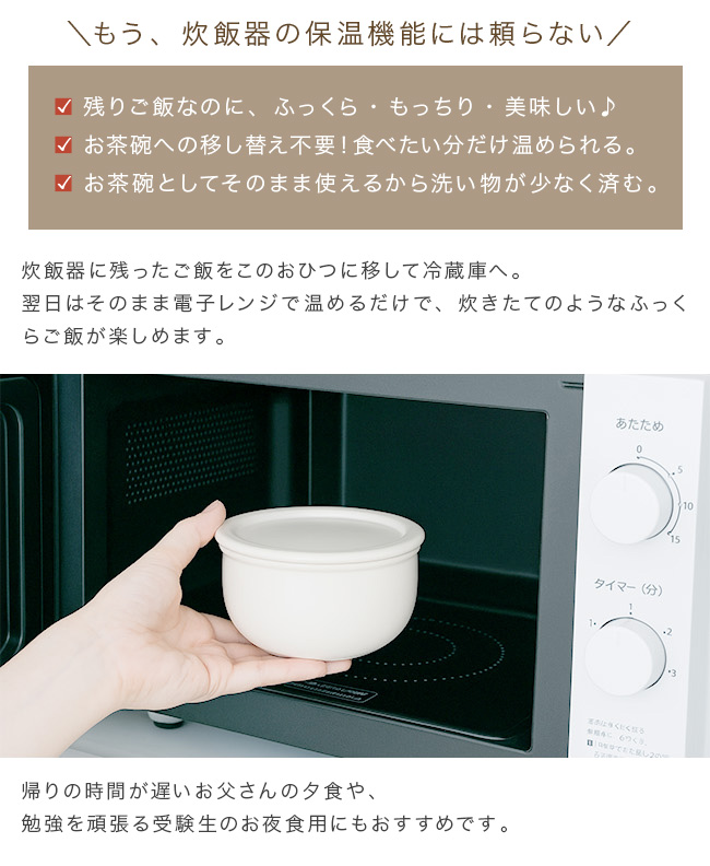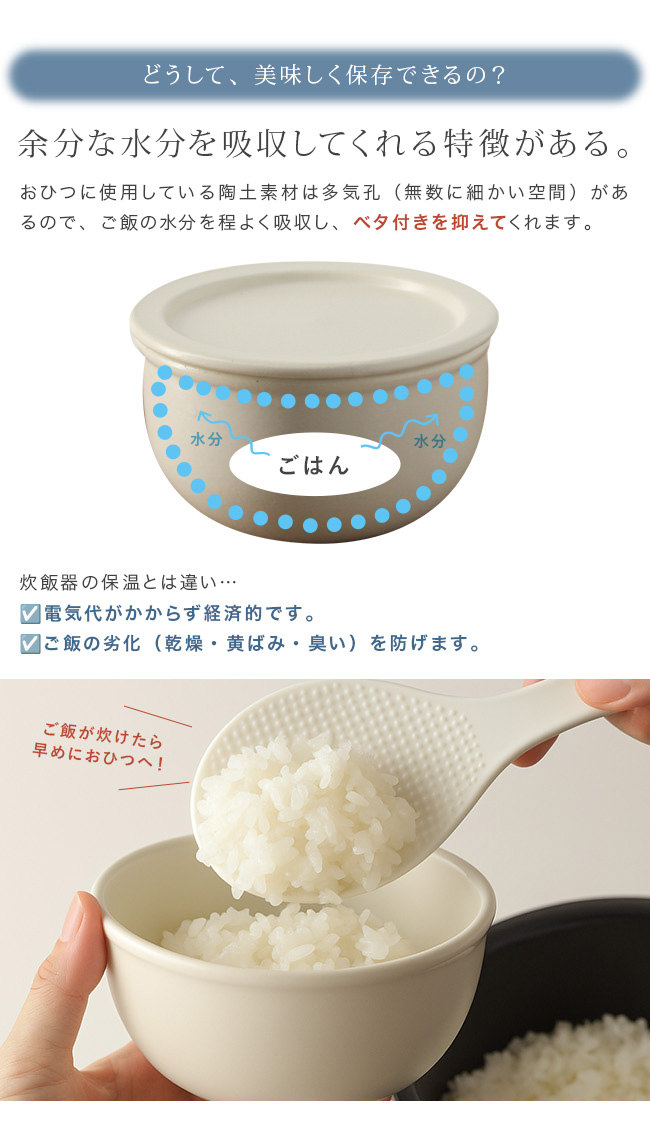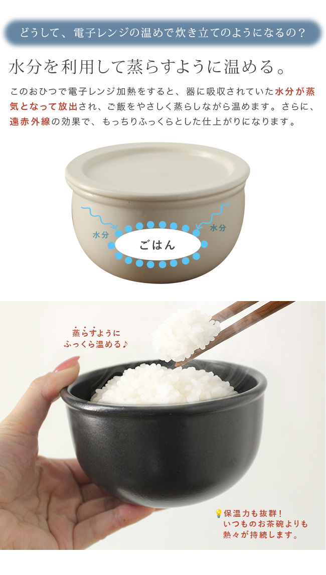 器に使用している陶土素材は多気孔(細かい空間が無数にある)なので、ごはんの水分を程よく吸収し、べた付きを抑えてくれます。炊飯器の保温機能で保存しないから、電気代がかからないことと、ご飯の劣化(水分が抜ける・黄ばみ・臭い)を防げます。電子レンジで加熱すると、器が吸収していた水分が蒸気となって放出され、ご飯を蒸らすように温めます。さらに、遠赤効果により、ふっくら・もっちりとした触感になります。